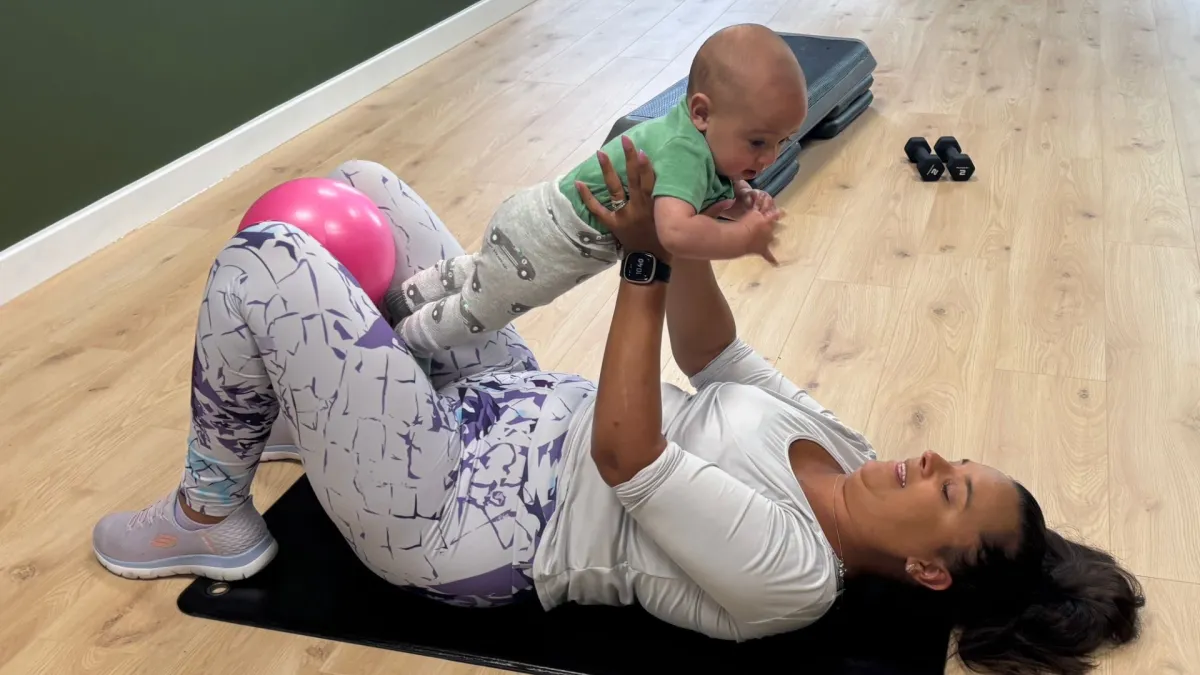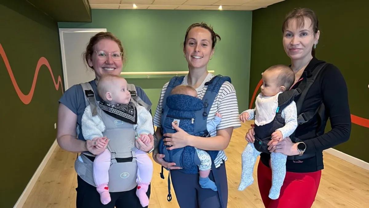 A fun, energetic class designed for mums with babies in a carrier, combining dance-inspired moves to boost your cardio and tone your body